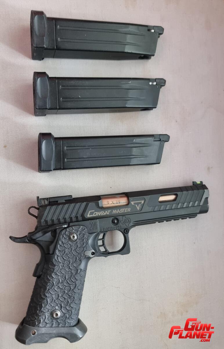 Cargador: 30 cartuchos de gas verde. Debe utilizar únicamente el cargador de gas verde. Compatible con otros cargadores AW Custom, WE-Tech, Tokyo Marui Hi-Capa Green Gas.